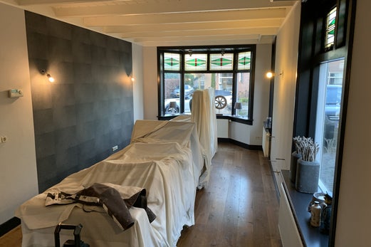 In Ede heb ik deze mooie jaren 30 woonkamer mogen schilderen en behangen. Op de wanden is glasweefsel aangebracht en deze zijn in een licht grijze kleur geschilderd. Het houtwerk is gegrond en afgeschilderd in een zijdeglans lak Ral 9004.